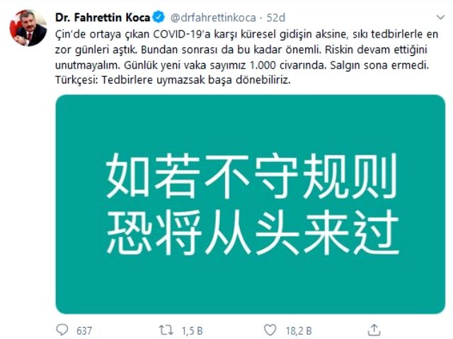 Koca, Twitter hesabından yaptığı paylaşımda şunları kaydetti: "Çin'de ortaya çıkan Kovid-19'a karşı küresel gidişin aksine, sıkı tedbirlerle en zor günleri aştık. Bundan sonrası da bu kadar önemli. Riskin devam ettiğini unutmayalım. Günlük yeni vaka sayımız 1000 civarında. Salgın sona ermedi, Türkçesi: Tedbirlere uymazsak başa dönebiliriz."