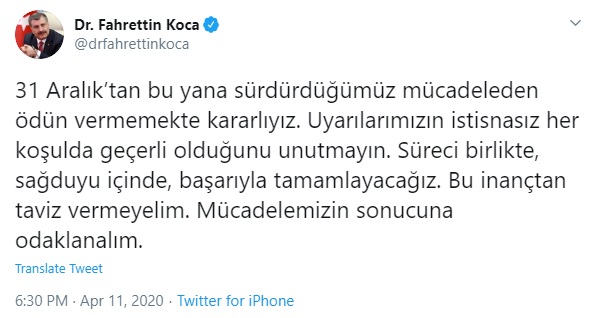 "31 Aralık’tan bu yana sürdürdüğümüz mücadeleden ödün vermemekte kararlıyız. Uyarılarımızın istisnasız her koşulda geçerli olduğunu unutmayın. Süreci birlikte, sağduyu içinde, başarıyla tamamlayacağız. Bu inançtan taviz vermeyelim. Mücadelemizin sonucuna odaklanalım."