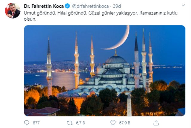 Bakan Koca, Twitter hesabından yaptığı paylaşımda, "Umut göründü. Hilal göründü. Güzel günler yaklaşıyor. Ramazanınız kutlu olsun" şeklinde ifadeler kullandı.