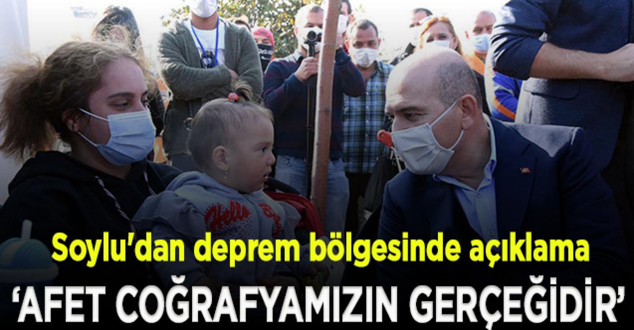 30 Ekim Cuma günü Seferihisar'da meydana gelen depremde 116 kişinin yaşamını yitirdiğini belirten Bakan Soylu, "Öncelikle hayatını kaybedenlere Allah'tan rahmet diliyorum. Hem İzmir'imize hem de tüm milletimize başsağlığı dileklerimi ifade ediyorum. 1033 vatandaşımız da yaralandı. Kimisi taburcu edildi, kimisinin de tedavileri devam ediyor. Hastaneden çıkanlara sağlık ve afiyet diliyorum. Afet bizim coğrafyamızın gerçeğidir. En son gördük ki birçok afetle karşı karşıya kalabiliyoruz. Bunlara yönelik alacağımız tedbirler, afeti coğrafyamızda her zaman karşı karşıya kalabileceğimize yönelik olmalıdır. Öncelikle tekrar İzmirli hemşehrilerimize hem başsağlığı hem de geçmiş olsun dileklerimi yineliyorum. Depremin ilk anından itibaren devlet, bütün gücüyle bütün kamu kurum ve kuruluşlarıyla belediyeler ile hem görevleri icabı hem de insanilikleri gereği ellerinden gelen bütün gayretlerini ortaya koymuşlardır" diye konuştu.