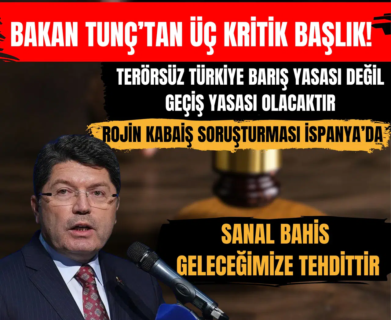 Adalet Bakanı Yılmaz Tunç, yasa dışı sanal bahis, bilişim dolandırıcılığı ve kamuoyunda yakından takip edilen önemli soruşturmalara ilişkin dikkat çeken açıklamalarda bulundu. Sanal bahsin toplumsal bir tehdit haline geldiğini vurgulayan Tunç, Rojin Kabaiş soruşturmasına dair de son bilgileri paylaştı.