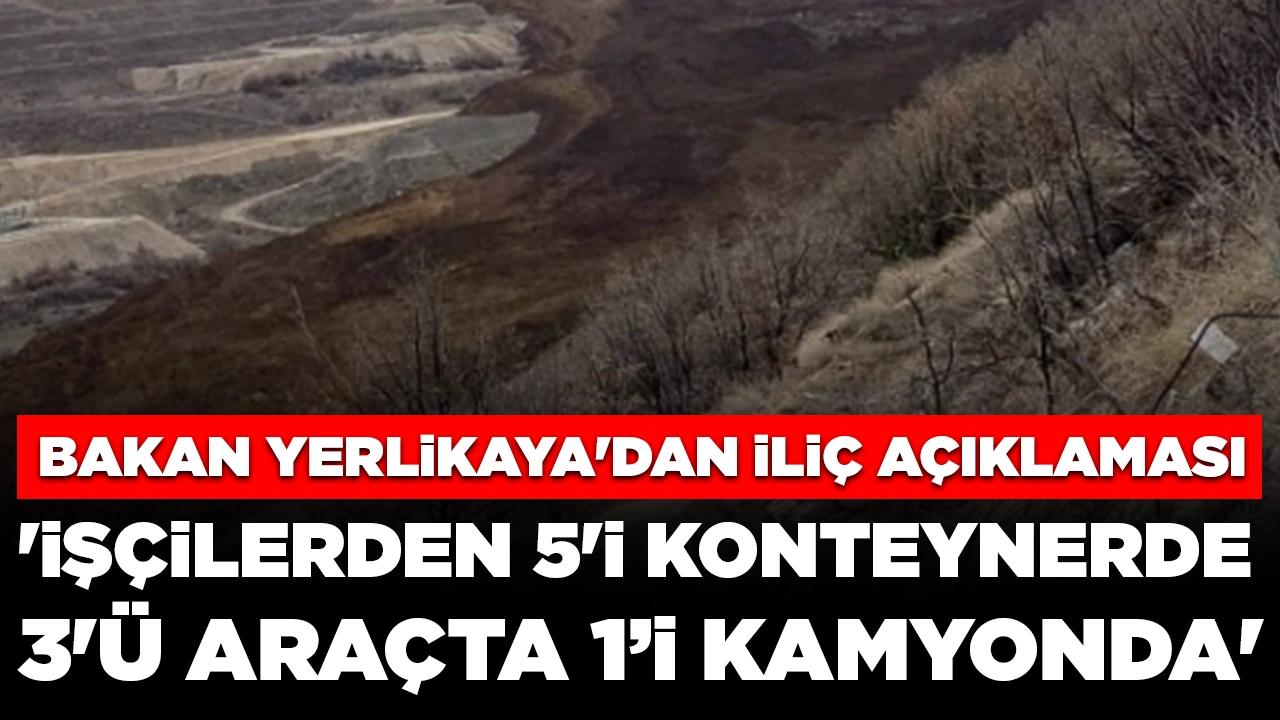 İçişleri Bakanı Ali Yerlikaya; Erzincan" ın İliç ilçesi'ndeki altın madeni ocağında meydana gelen toprak kaymasına ilişkin "İnsan kaynakları ve personel açısından hiçbir ihtiyacımız yok. Yapılan tüm değerlendirmelerde aradığımız arkadaşlar 5'inin bir konteyner içinde yer aldığı 3'ünün bir araç içinde ve aynı bölgede yer aldığı, bir şoför kardeşimizin de kamyon içinde başka bir bölgede olduğu değerlendiriliyor." dedi.