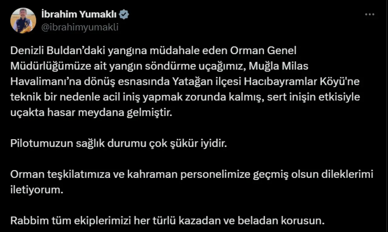 Tarım ve Orman Bakanı İbrahim Yumaklı, sosyal medya hesabı X üzerinden yaptığı açıklamada, “Denizli Buldan’daki yangına müdahale eden Orman Genel Müdürlüğümüze ait yangın söndürme uçağımız, Muğla Milas Havalimanı’na dönüş esnasında Yatağan ilçesi Hacıbayramlar Köyü'ne teknik bir nedenle acil iniş yapmak zorunda kalmış, sert inişin etkisiyle uçakta hasar meydana gelmiştir.” ifadelerini kullandı.