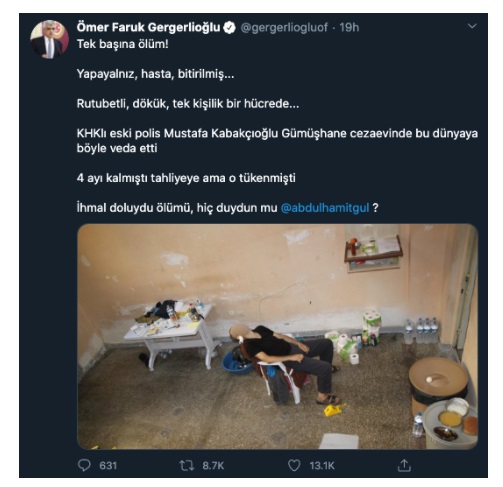 Olay, HDP Kocaeli Milletvekili Ömer Faruk Gergerlioğlu'nun Twitter paylaşımına da konu olmuş, mesajda, KHK'lı eski polis Mustafa Kabakçıoğlu'nun Gümüşhane cezaevinde, tahliyesine dört ay kala öldüğü belirtilmişti.