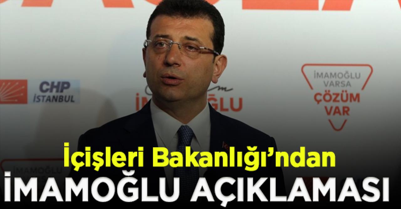 İçişleri Bakanlığı, İstanbul Büyükşehir Belediye Başkanı Ekrem İmamoğlu hakkında, Kanal İstanbul Projesi'ne karşı çıktığı için soruşturma açıldığı iddiasıyla ilgili, "İfade talep yazısında Sayın Ekrem İmamoğlu'nun Kanal İstanbul Projesi'ne kişisel olarak karşı çıkması sorgulanmadığı gibi bölücülük suçlaması da bulunmamaktadır" açıklamasını yaptı.