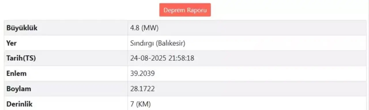 Balıkesir'in Sındırgı ilçesi, bir kez daha yerin derinliklerinden yükselen bir sarsıntıyla geceye uyanmak zorunda kaldı. 24 Ağustos 2025 saat 21.58'de AFAD verilerine göre 4.8 büyüklüğünde kaydedilen deprem, yalnızca Sındırgı ile sınırlı kalmadı; Manisa, Kütahya ve Bursa gibi çevre illerde de net şekilde hissedildi.