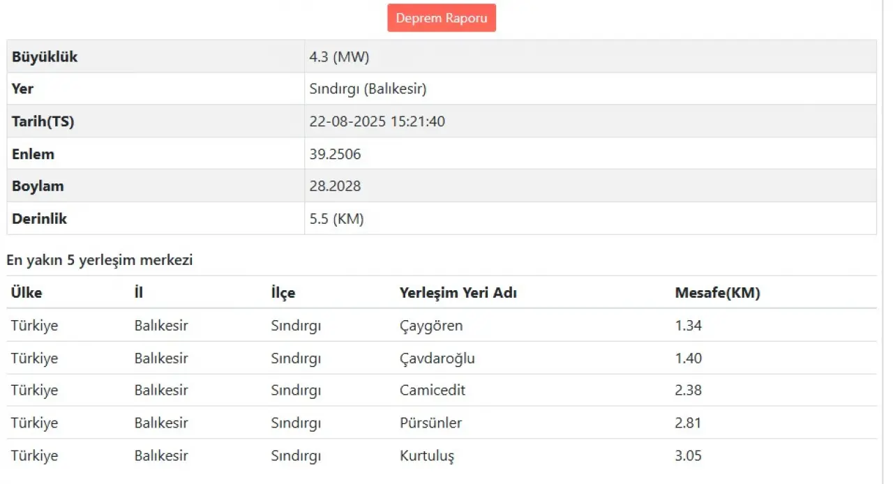 Balıkesir’in Sındırgı ilçesinde bugün öğleden sonra saat 15.21’de 4,3 büyüklüğünde deprem meydana geldi. Afet ve Acil Durum Yönetimi Başkanlığı (AFAD), depremin merkez üssünün Sındırgı olduğunu ve 5,5 kilometre derinlikte kaydedildiğini duyurdu.