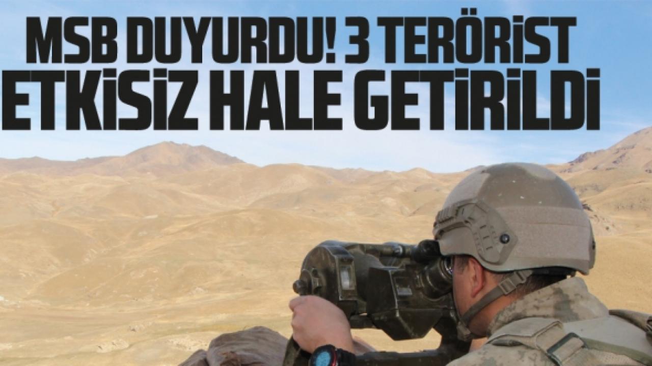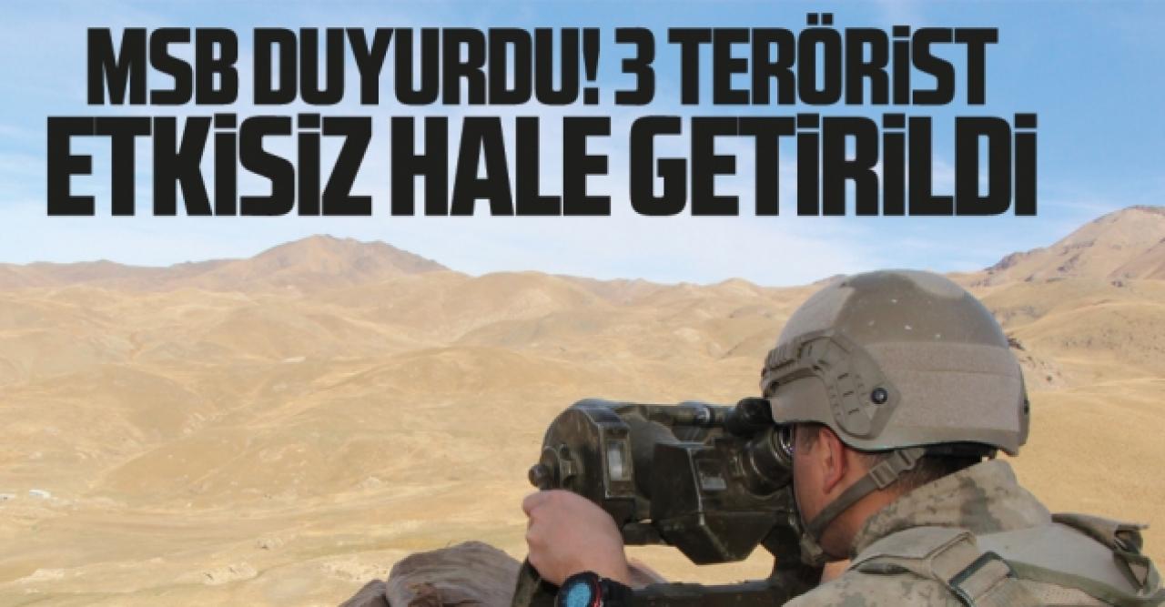 Milli Savunma Bakanlığı'ndan yapılan açıklamada Barış Pınarı Bölgesi'nde taciz ateşi açarak sınırı geçmeye çalışan 3 teröristin etkisiz hale getirildiği duyuruldu.