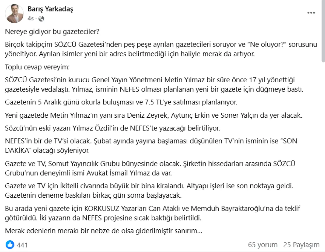 Yarkadaş'ın yazısına göre Sözcü Gazetesi'nin Genel Yayın Yönetmeni Metin Yılmaz, Deniz Zeyrek, Aytunç Erkin, Soner Yalçın ve Sözcü'nün eski yazarı Yılmaz Özdil de Nefes'te yer alacak.