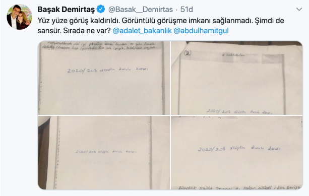 Sosyal medya hesabından açıklama yapan Başak Demirtaş Adalet Bakanı Abdulhamit Gül'ü etiketleyerek, "Yüz yüze görüş kaldırıldı. Görüntülü görüşme imkanı sağlanmadı. Şimdi de sansür. Sırada ne var?” diye sordu.