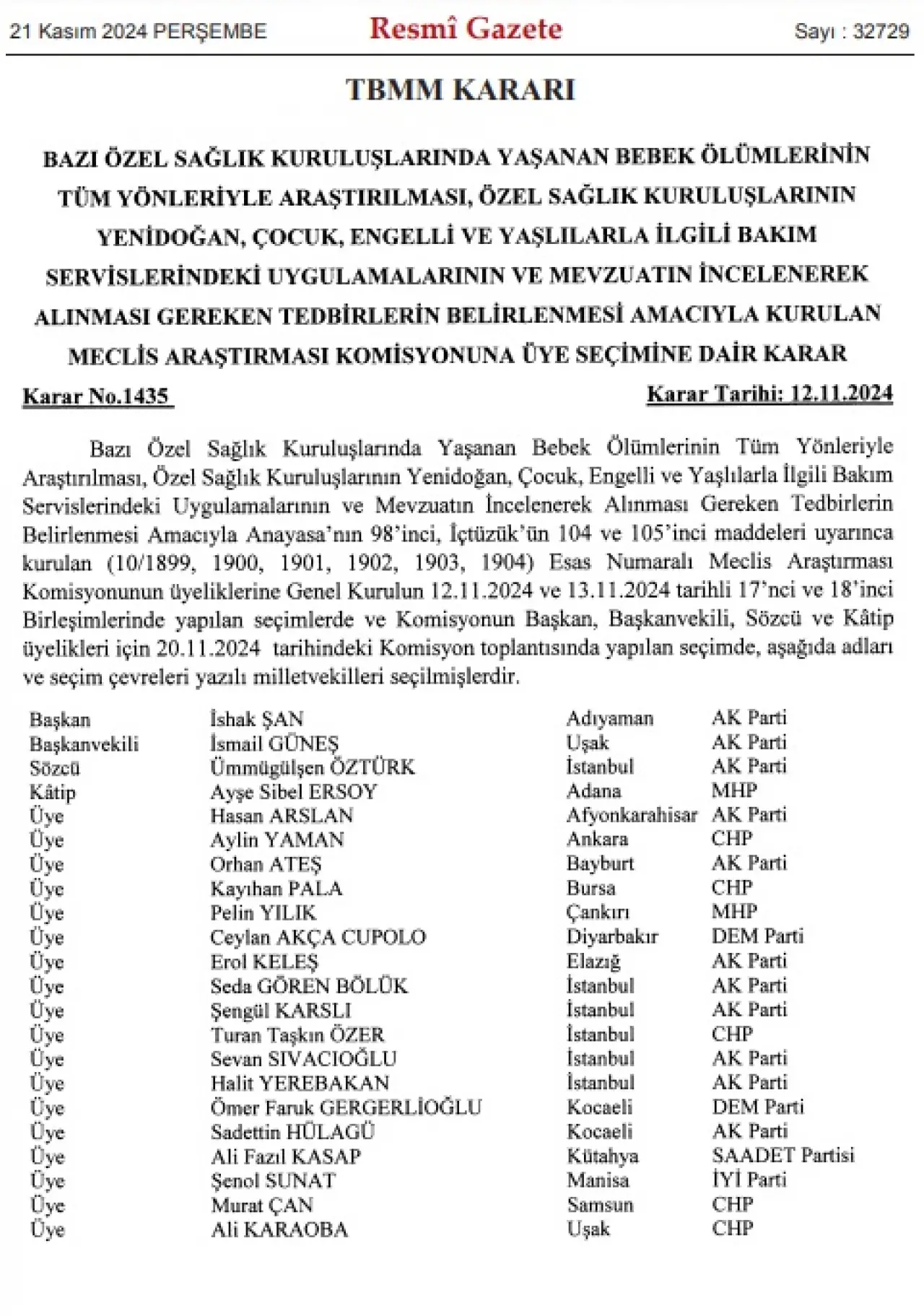 Türkiye Büyük Millet Meclisi (TBMM) Genel Kurulu, Anayasa'nın 98'inci ve İçtüzük'ün 104 ve 105'inci maddeleri uyarınca, özel sağlık kuruluşlarındaki bebek ölümleri ve ilgili bakım hizmetlerinin detaylı bir şekilde incelenmesi amacıyla bir Meclis Araştırması Komisyonu kurulmasını kararlaştırdı. Komisyon üyelikleri, 12 ve 13 Kasım 2024 tarihlerinde yapılan seçimler sonucu belirlendi. Komisyonun başkan, başkanvekili, sözcü ve katip üyeleri ise 20 Kasım 2024’te düzenlenen toplantıda seçildi.