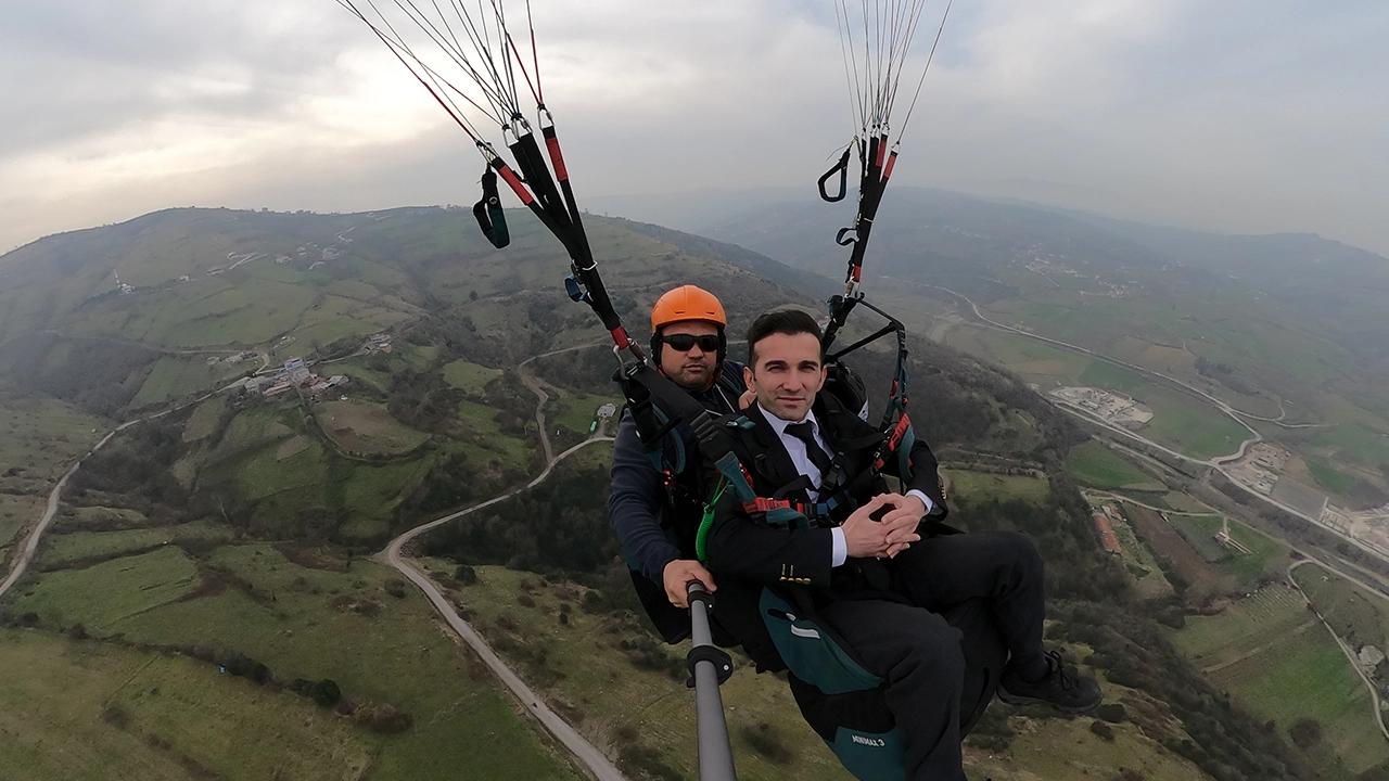 Samsun'da Zafer Partisi Atakum Belediye başkan adayı Tugay Başsan, projelerini yamaç paraşütüyle uçarak açıkladı.
