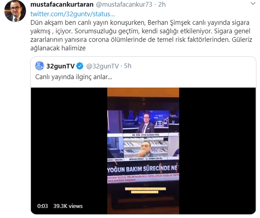 Program sürerken kendisinin görüntüsünün de ekranda olduğunu fark etmeyen Berhan Şimşek bir sigara yaktı. Reji, hemen Şimşek’in görüntüsünü yayından kaldırdı. Sağlık konusunun konuşulduğu programda Berhan Şimşek’in sigara yakması Twitter’da en çok paylaşılanlar arasında girdi.