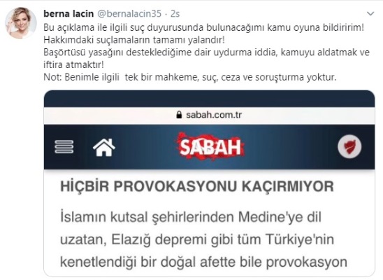 Twitter hesabından konu hakkında açıklama yapan Berna Laçin, "Sadece başörtüsü değil her konuda özgürlükten taraf durduğum ortadadır" ifadelerini kullandı. Turkuvaz Grubu'ndan tekzip isteyen Laçin'in açıklaması şu şekilde: