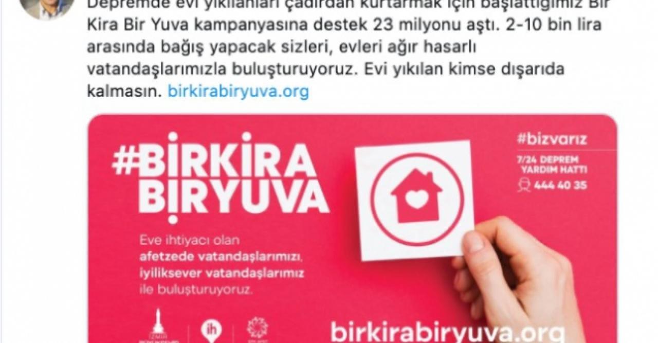 Sosyal medya hesabından yaptığı açıklamada Soyer, "Depremde evi yıkılanları çadırdan kurtarmak için başlattığımız Bir Kira Bir Yuva kampanyasına destek 23 milyonu aştı. 2-10 bin lira arasında bağış yapacak sizleri, evleri ağır hasarlı vatandaşlarımızla buluşturuyoruz. Evi yıkılan kimse dışarıda kalmasın. http://birkirabiryuva.org" ifadesini kullandı.