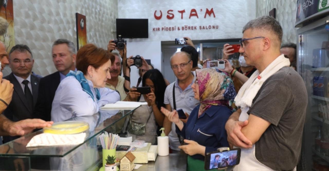 Akşener ziyaret ettiği hediyelik eşya dükkânı sahibi bir yurttaş ise, “Şu anda durum iyi değil, fiyatlar anormal, böyle bir fiyat olamaz. Ben müşteriye fiyat söylerken utanıyorum. 500 liraya sattım, bin 100 liraya geri aldım. Arkanızda çocuk simidi var; 100 liraya ya da 125 liraya aldım. Emin olun, getiren arkadaş ile bir müşteri arkadaş tesadüfen buradaydı; ‘bin lira’ dedi” diye konuştu. Akşener ise, “Yanlış anlaşılmasın 150 liraya alıp yerine koyup üzerine 200 liradan satacağı zaman 50 lira kar elde edeceği şeyin yerine 1000 liradan koyuyor. Ondan sonra onu ‘kaça satacağım’ diyor” sözleriyle yurttaşın anlattığı sorunu özetledi.