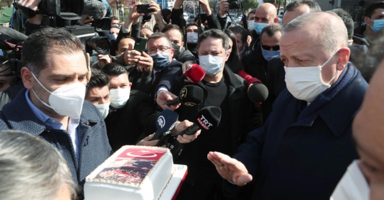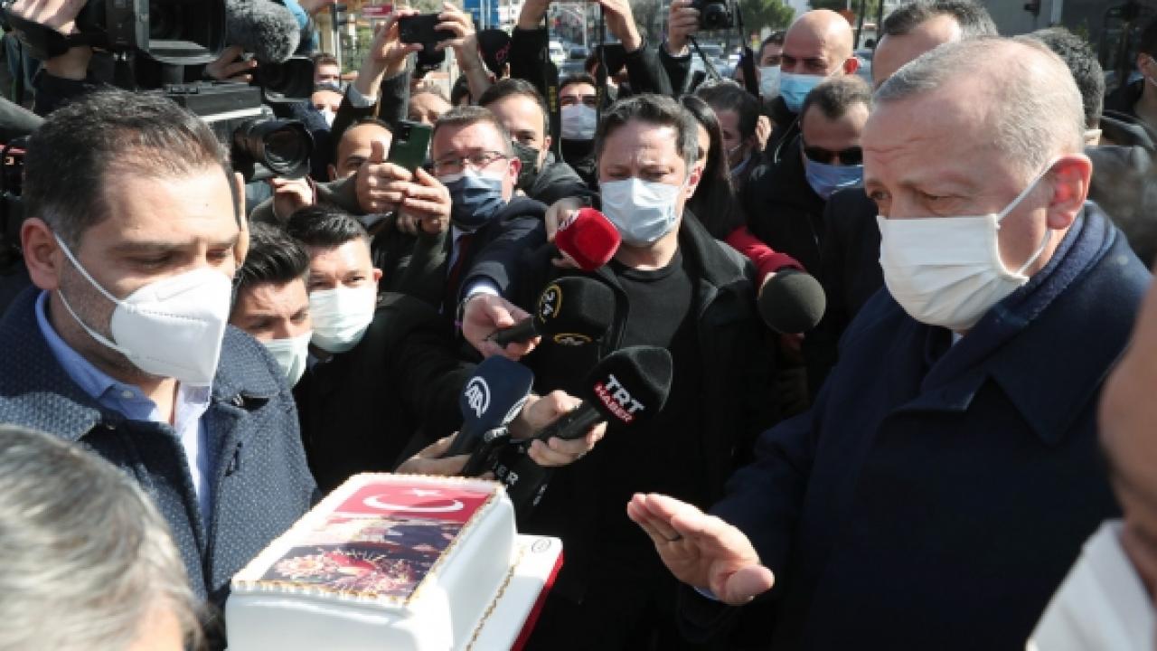 Pastanenin sahibi Köksal Kantarcı ve çalışanları hazırladıkları pastayla Erdoğan'ı karşılayarak, "Nice seneleriniz olsun, Allah size uzun ömürler versin" dedi. Cumhurbaşkanı Erdoğan da "Hep birlikte nice yıllara inşallah. Ülkemizi ileri seviyelere tırmandırarak o günleri hep birlikte yaşamayı Allah bizlere nasip eder inşallah" dedi.