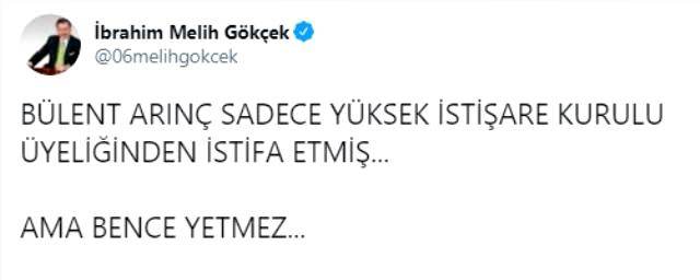 Bülent Arınç istifasıyla ilgili sosyal medya hesabından paylaşım yapan Gökçek, "Bülent Arınç sadece Yüksek İstişare Kurulu üyeliğinden istifa etmiş. Bence yetmez" sözlerine yer verdi.