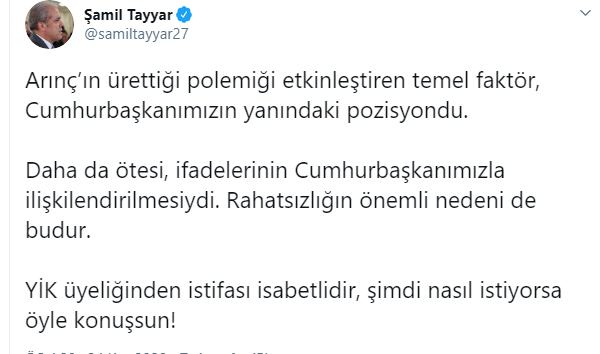 Sosyal medya hesabından istifayı değerlendiren AK Parti eski milletvekili Şamil Tayyar, ''Arınç’ın ürettiği polemiği etkinleştiren temel faktör, Cumhurbaşkanımızın yanındaki pozisyondu. Daha da ötesi, ifadelerinin Cumhurbaşkanımızla ilişkilendirilmesiydi. Rahatsızlığın önemli nedeni de budur. YİK üyeliğinden istifası isabetlidir, şimdi nasıl istiyorsa öyle konuşsun!'' ifadelerini kullandı.