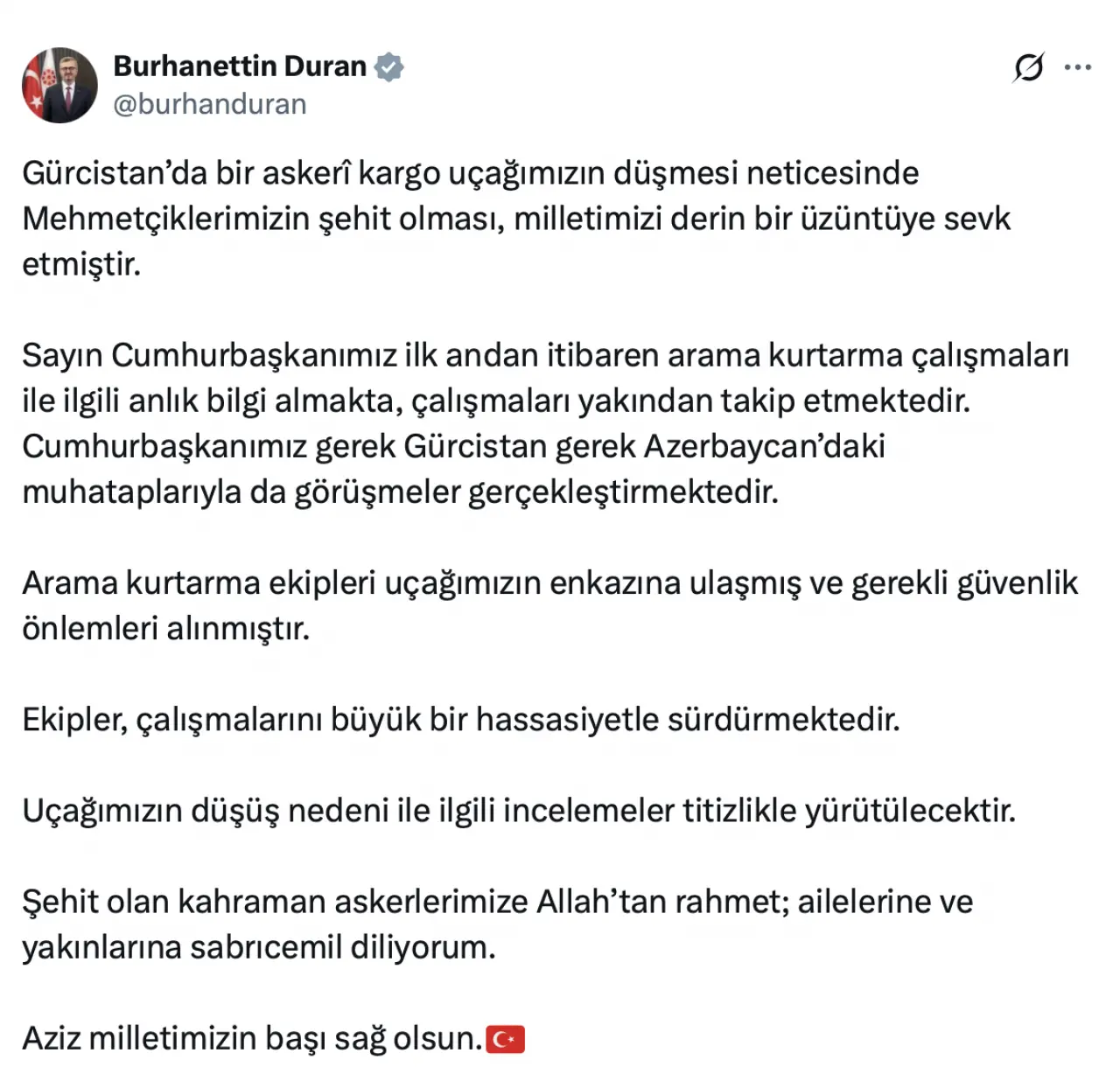 Türkiye Cumhuriyeti Cumhurbaşkanlığı İletişim Başkanı Burhanettin Duran, Gürcistan'da yaşanan askeri kargo uçağı kazası ve ardından şehit olan Mehmetçiklerimizle ilgili önemli açıklamalarda bulundu. Duran, olayın Türk milletini derin bir üzüntüye sevk ettiğini belirtirken, Cumhurbaşkanlığı'nın süreci ilk andan itibaren büyük bir hassasiyetle takip ettiğini vurguladı.