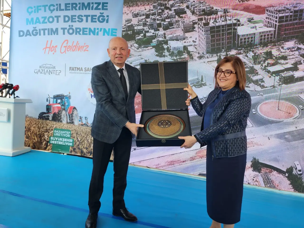 Konuşmaların ardından Volkan Group Yönetim Kurulu Başkanı Bilal Çeker, Büyükşehir Belediye Başkanı Fatma Şahin’e tarım sektörüne verdiği desteklerden dolayı hediye takdiminde bulundu. Ardından, Başkan Fatma Şahin ve protokol üyeleri, akaryakıt istasyonunda üreticilerin iş araçlarına akaryakıt dolumu yaparak, günün sonunda hatıra fotoğrafı çektirdi.