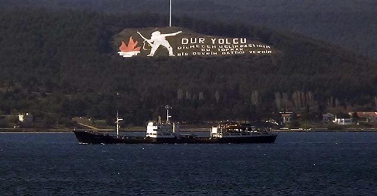 Kilitbahir köyü dağında yer alan 'Dur Yolcu' yazısı ile kalenin önünden geçen akaryakıt dolu askeri tanker, Ege Denizi'ne doğru yol aldı.