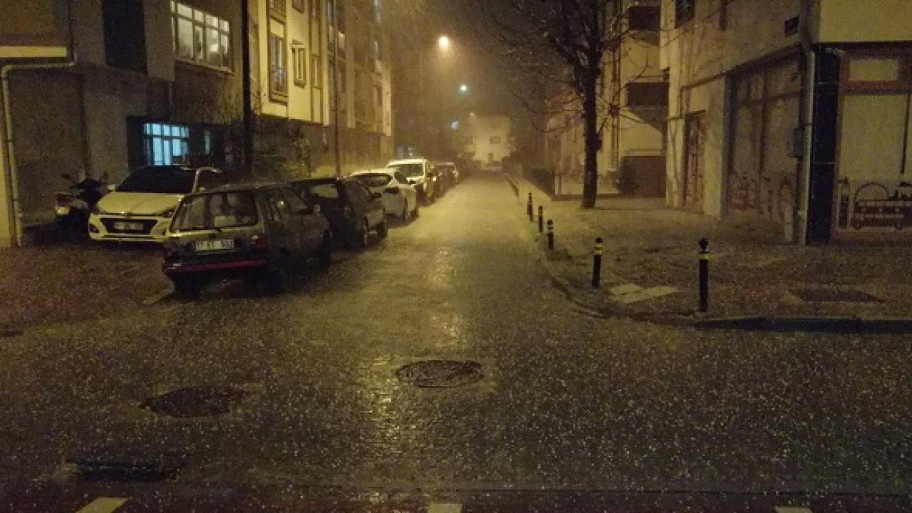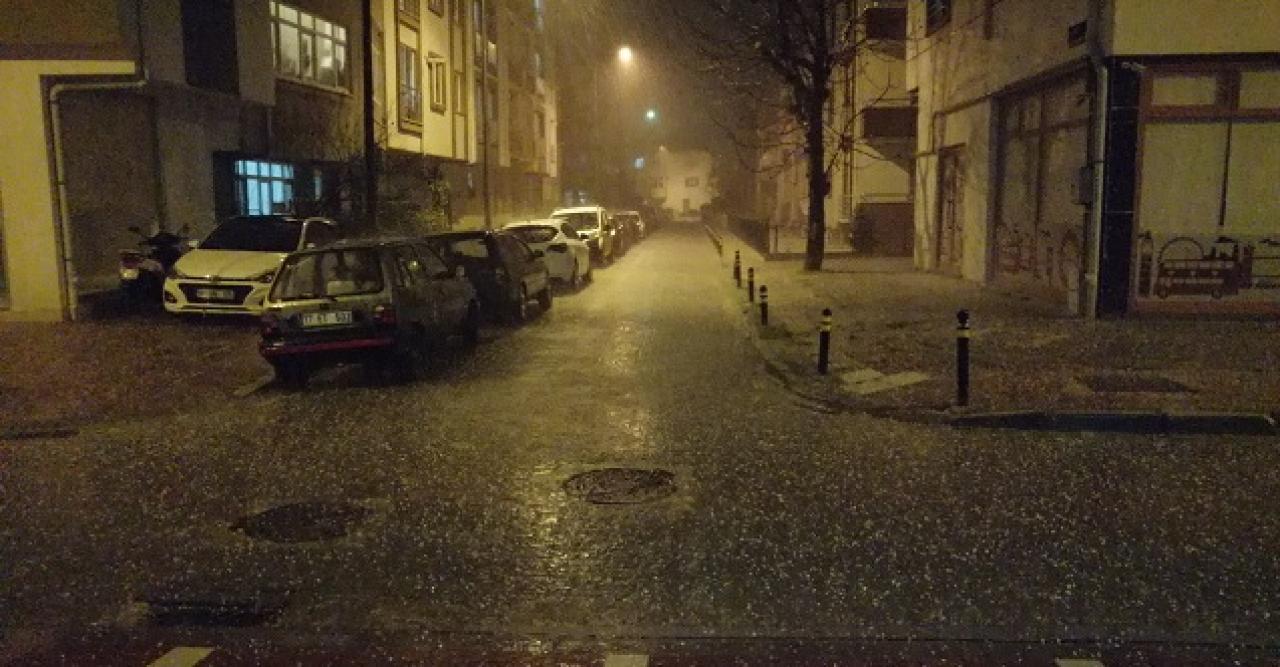 Çanakkale'de, akşam saatlerinde kuvvetli rüzgar ve sağanak ile birlikte bir süre yağan dolu nedeniyle kısa zamanda cadde ve sokakları beyaza bürüdü.