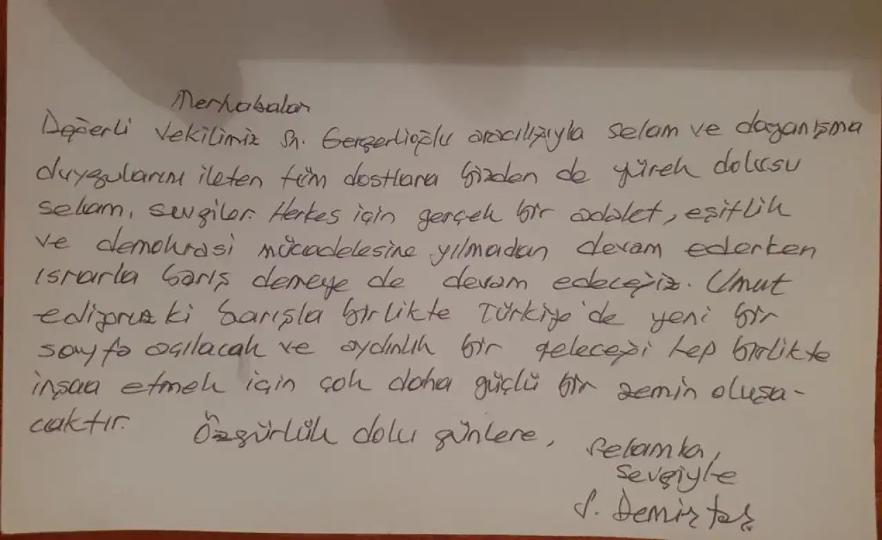 Paylaşımda ayrıca, “Barışla birlikte Türkiye’de yeni bir sayfa açılacak ve aydınlık bir gelecek hep birlikte inşa edilecek” değerlendirmesi yer aldı. Cezaevinden gönderilen mesaj, “özgürlük dolu günler” temennisiyle son buldu.