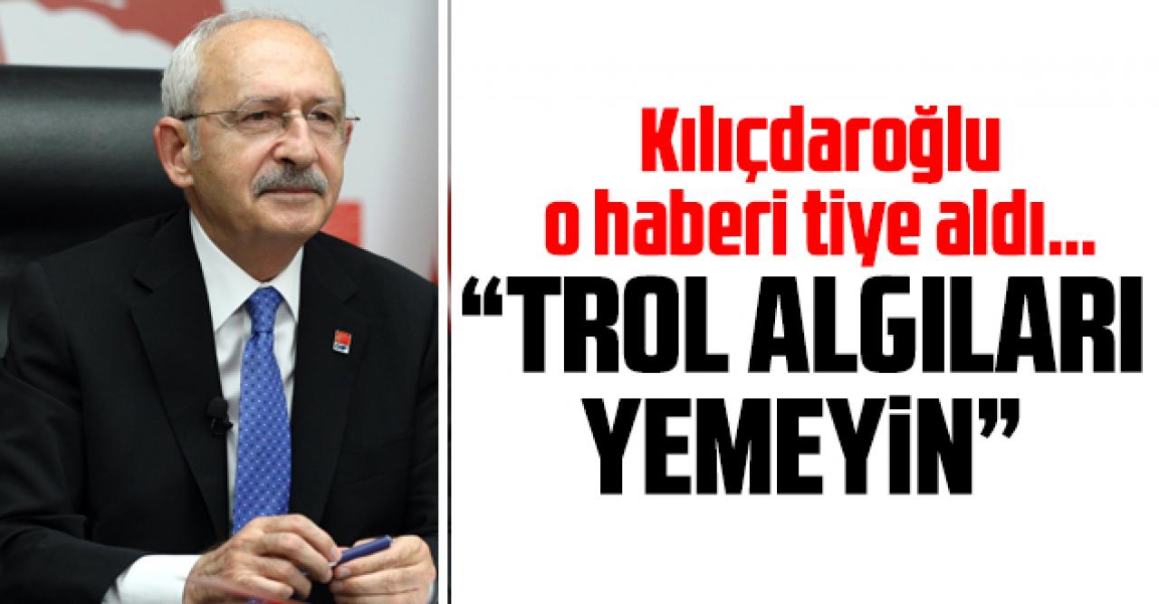 CHP Genel Başkanı Kemal Kılıçdaroğlu, sosyal medya hesabından Yeni Şafak'ın manşetini paylaşarak "Trol algılarını yemeyin" dedi.