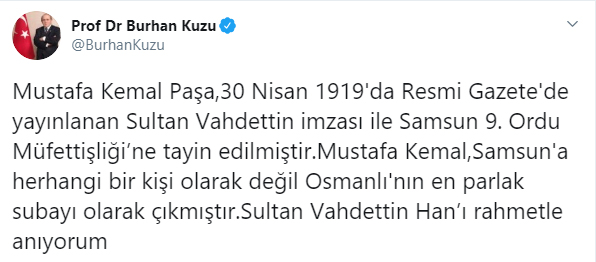 Kuzu, paylaşımında şu ifadeleri kullandı: "Mustafa Kemal Paşa,30 Nisan 1919’da Resmi Gazete’de yayınlanan Sultan Vahdettin imzası ile Samsun 9. Ordu Müfettişliği’ne tayin edilmiştir. Mustafa Kemal, Samsun’a herhangi bir kişi olarak değil Osmanlı’nın en parlak subayı olarak çıkmıştır. Sultan Vahdettin Han’ı rahmetle anıyorum."