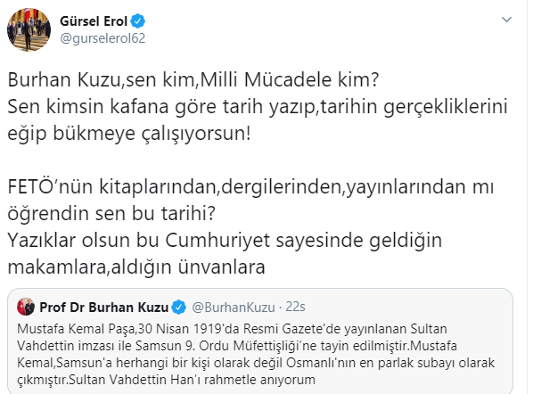 CHP’li Erol, ”Burhan Kuzu, sen kim, Milli Mücadele kim? Sen kimsin kafana göre tarih yazıp, tarihin gerçekliklerini eğip bükmeye çalışıyorsun! FETÖ’nün kitaplarından, dergilerinden, yayınlarından mı öğrendin sen bu tarihi? Yazıklar olsun bu Cumhuriyet sayesinde geldiğin makamlara, aldığın ünvanlara" ifadelerini kullandı.