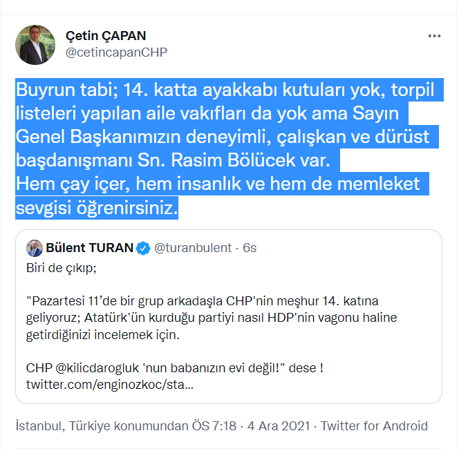 Çapan, Turan'a 17-28 Aralık'ta ortaya çıkan, 'ayakkabı kutularını, para sayma makinelerini' hatırlatarak, "Buyrun tabi; 14. katta ayakkabı kutuları yok, torpil listeleri yapılan aile vakıfları da yok ama Sayın Genel Başkanımızın deneyimli, çalışkan ve dürüst başdanışmanı Sn. Rasim Bölücek var.