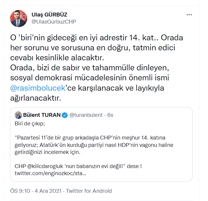 CHP'li Gürbüz de, Rasim Bölücek'i işaret etti, "O 'biri'nin gideceği en iyi adrestir 14. kat.. Orada her sorunu ve sorusuna en doğru, tatmin edici cevabı kesinlikle alacaktır.
