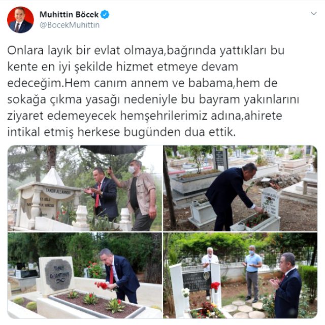 Antalya Büyükşehir Belediye Başkanı Muhittin Böcek, aile üyelerinin kabrini ziyaret etti. O esnada çekilen fotoğrafları ise "Onlara layık bir evlat olmaya,bağrında yattıkları bu kente en iyi şekilde hizmet etmeye devam edeceğim.Hem canım annem ve babama,hem de sokağa çıkma yasağı nedeniyle bu bayram yakınlarını ziyaret edemeyecek hemşehrilerimiz adına,ahirete intikal etmiş herkese bugünden dua ettik" notuyla paylaştı.