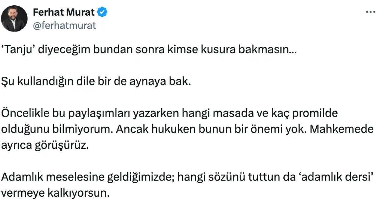 Tanju Özcan, fotoğraf sonrası yaptığı paylaşımda gazeteciye ağır sözler yöneltirken, Murat da geri adım atmadı. Murat, Özcan’a “Kumarhane ziyaretini gizlemedim, sadece kamuoyuna gösterdim. Asıl senin kullandığın dil seviyeni ortaya koyuyor” diyerek yanıt verdi. Tartışma kısa sürede kişisel sataşmalara dönüştü.