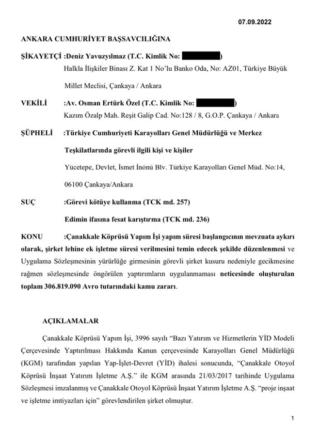 Suç duyurusunda bulunduğunu açıklayan Yavuzyılmaz, "AK Parti tarzı yap-işlet-devret hilesi. Çanakkale Köprüsü işinin yapım süresinin, şirkete ek işletme süresi verilecek şekilde mevzuata aykırı başlatıldığını yapıldığını tespit ettik. Kamu zararı: 306.819.090 Euro! Suç duyurusunda bulundum!" dedi.