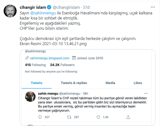 “Sayın @sahinmengu ile Esenboğa Havalimanı'nda karşılaşmış, uçak kalkana kadar kısa bir sohbet de etmiştik. Engellemiş ve aşağıdakileri yazmış. CHP'liler şunu bilsin isterim: Çoğulcu demokrasi için eşit şartlarda herkesle çalıştım ve çalışırım.”