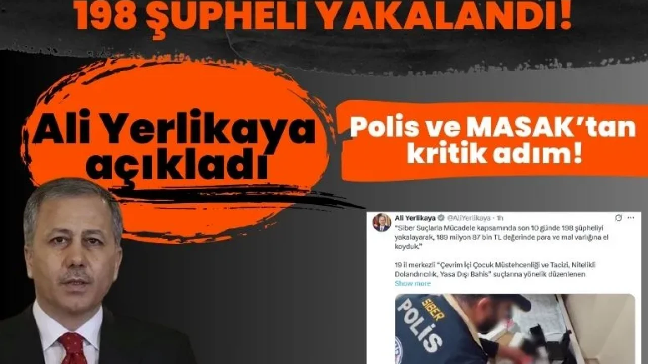 İçişleri Bakanı Ali Yerlikaya, Türkiye genelinde siber suçlarla mücadelede önemli bir adım atıldığını duyurdu. Bakan Yerlikaya, son 10 gün içinde yapılan operasyonlarda 198 şüphelinin yakalandığını, 49’unun tutuklandığını ve 10’unun adli kontrol hükümleriyle serbest bırakıldığını açıkladı.