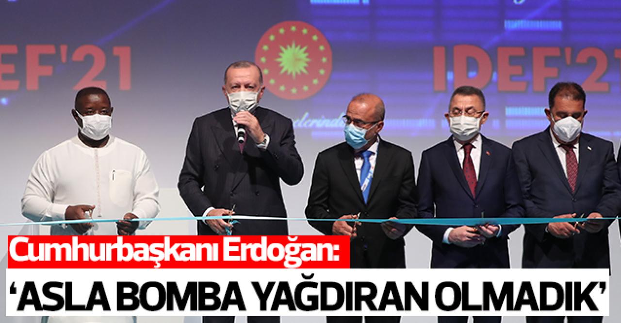 Erdoğan, "Asla sınırlarından on binlerce kilometre ötede terörle mücadele adı altında sivil-masum demeden insanların başına bomba yağdıranlardan olmadık, olmayacağız" şeklinde konuştu.
