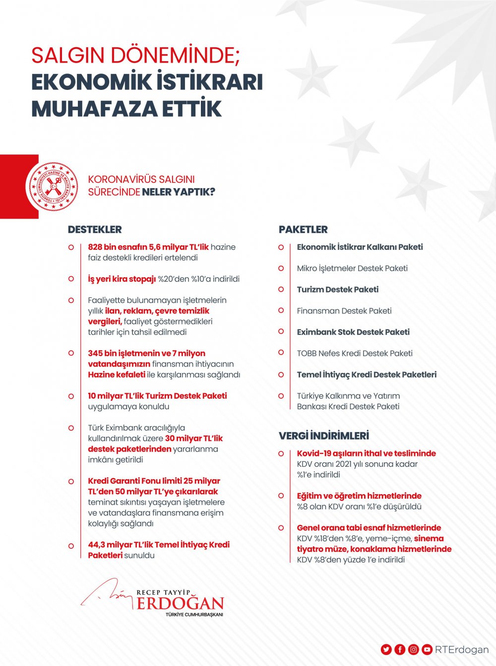 Salgın döneminde hükümetin verdiği destekler, paketler ve vergi indirimlerine değinen Erdoğan, "Hemen her sektörümüzü ilgilendiren destek paketleri ve düzenlemelerle ekonomik istikrarı muhafaza ettik" diyerek; salgın döneminde verilen destek, paket ve vergi indirimlerini şöyle sıraladı: