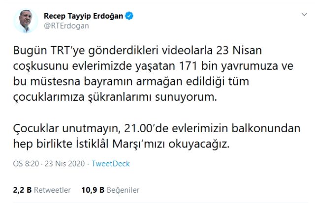 Erdoğan mesajında şu ifadeleri kullandı: "Bugün TRT'ye gönderdikleri videolarla 23 Nisan coşkusunu evlerimizde yaşatan 171 bin yavrumuza ve bu müstesna bayramın armağan edildiği tüm çocuklarımıza şükranlarımı sunuyorum. Çocuklar unutmayın, 21.00'de evlerimizin balkonundan hep birlikte İstiklâl Marşı'mızı okuyacağız."