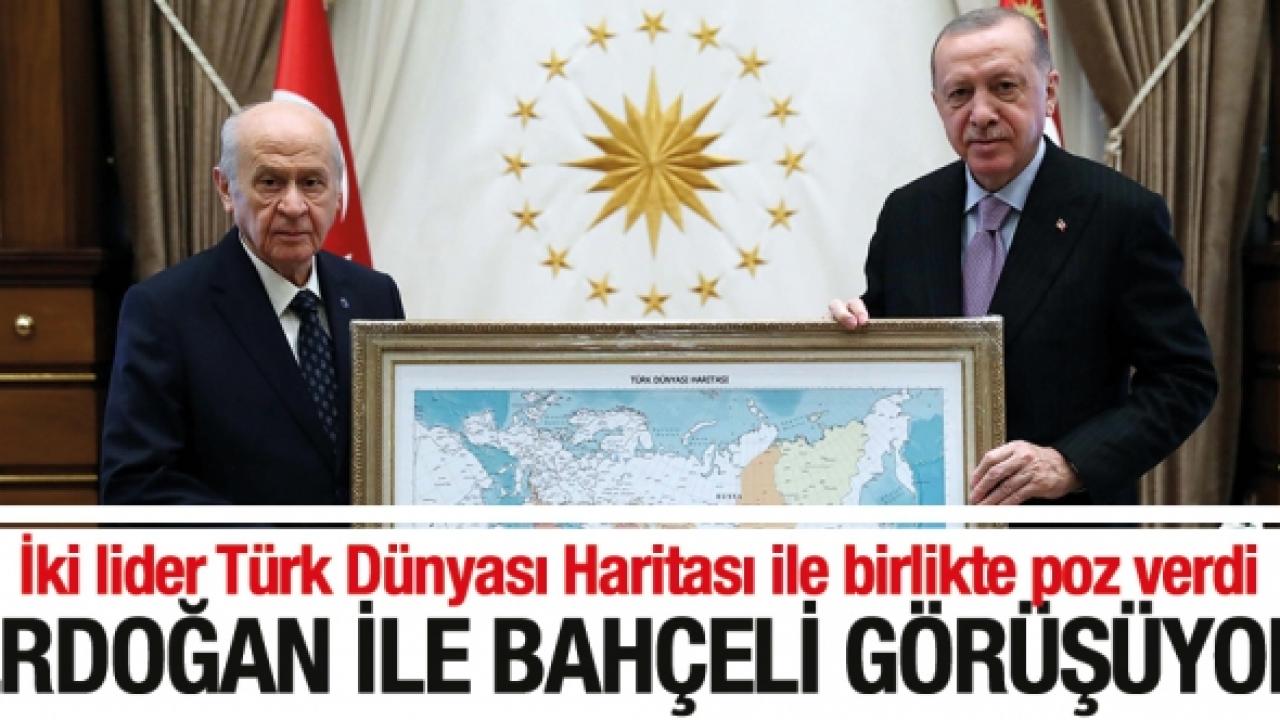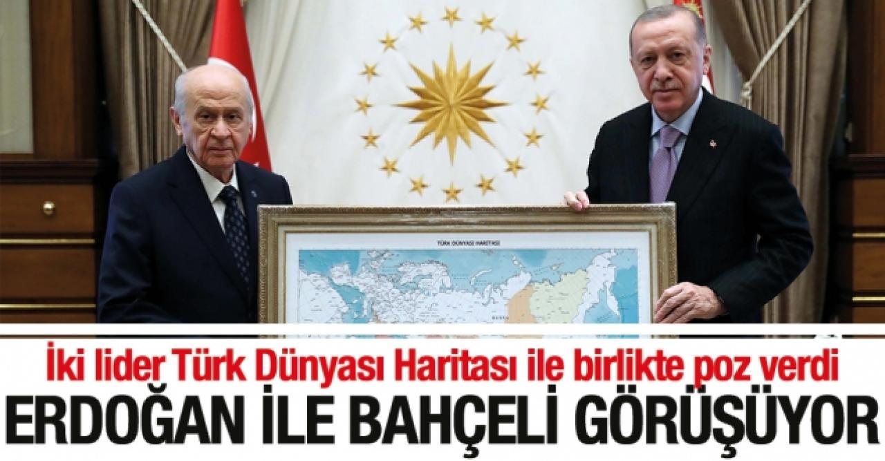 Saat 14.10'da başlayan görüşme öncesi iki lider Türk Dünyası Haritası ile birlikte poz verdi. Görüşme basına kapalı devam ediyor.