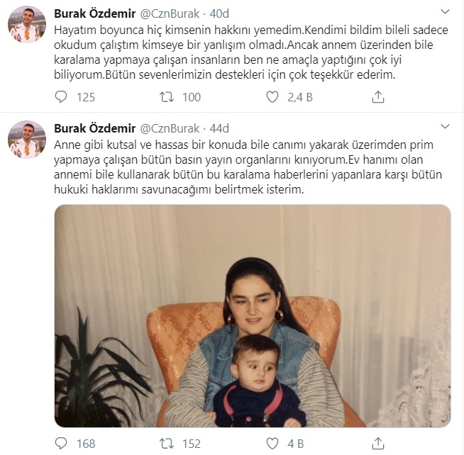 ‘CZN Burak’ lakaplı Muhammed Burak Özdemir, sosyal medya hesabında açıklama yaptı. Özdemir, “Hayatım boyunca hiç kimsenin hakkını yemedim. Kendimi bildim bileli sadece okudum çalıştım kimseye bir yanlışım olmadı. Ancak annem üzerinden bile karalama yapmaya çalışan insanların ben ne amaçla yaptığını çok iyi biliyorum. Bütün sevenlerimizin destekleri için çok teşekkür ederim” ifadelerini kullandı.