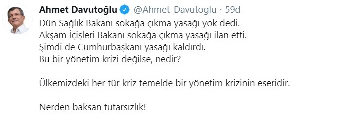 "Dün Sağlık Bakanı sokağa çıkma yasağı yok dedi. Akşam İçişleri Bakanı sokağa çıkma yasağı ilan etti. Şimdi de Cumhurbaşkanı yasağı kaldırdı. Bu bir yönetim krizi değilse, nedir? Ülkemizdeki her tür kriz temelde bir yönetim krizinin eseridir. Nerden baksan tutarsızlık!"