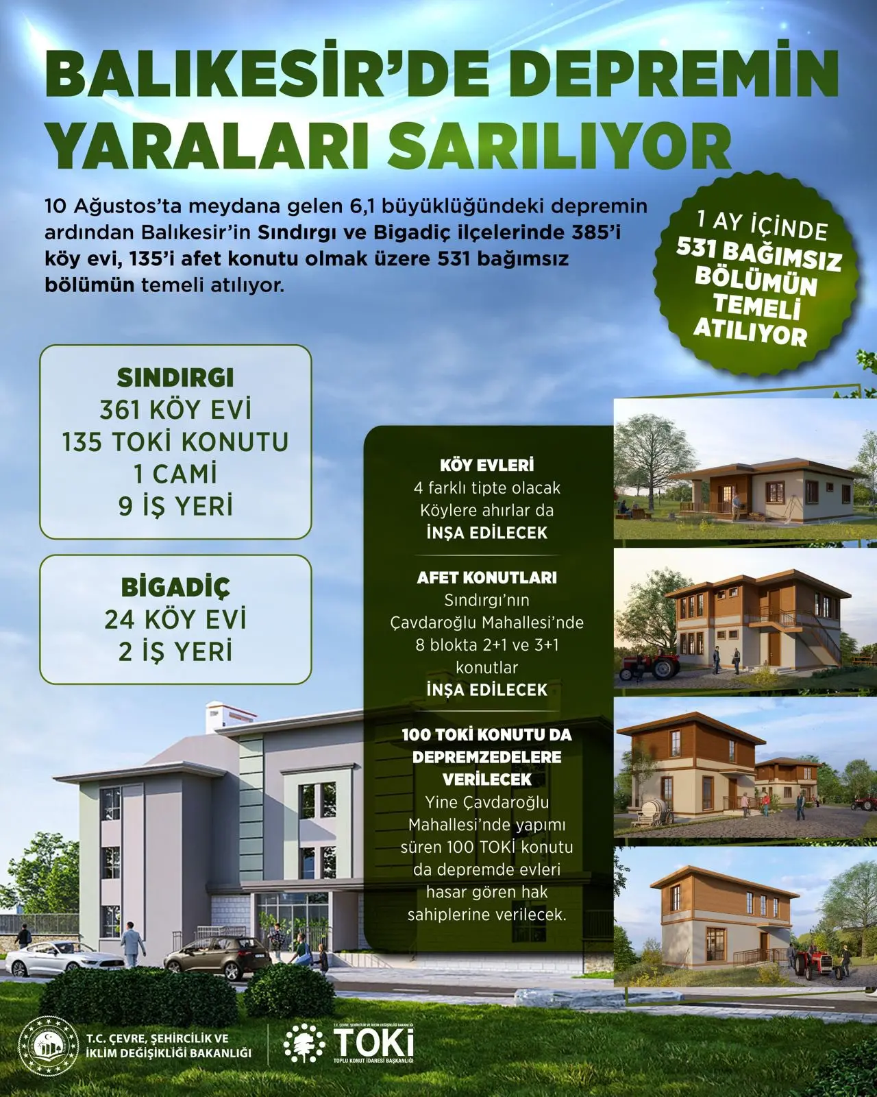 Balıkesir’in Sındırgı ilçesinde 10 Ağustos’ta meydana gelen 6,1 büyüklüğündeki depremin ardından, afetzedeler için inşa edilecek 531 bağımsız bölümün temeli atıldı.