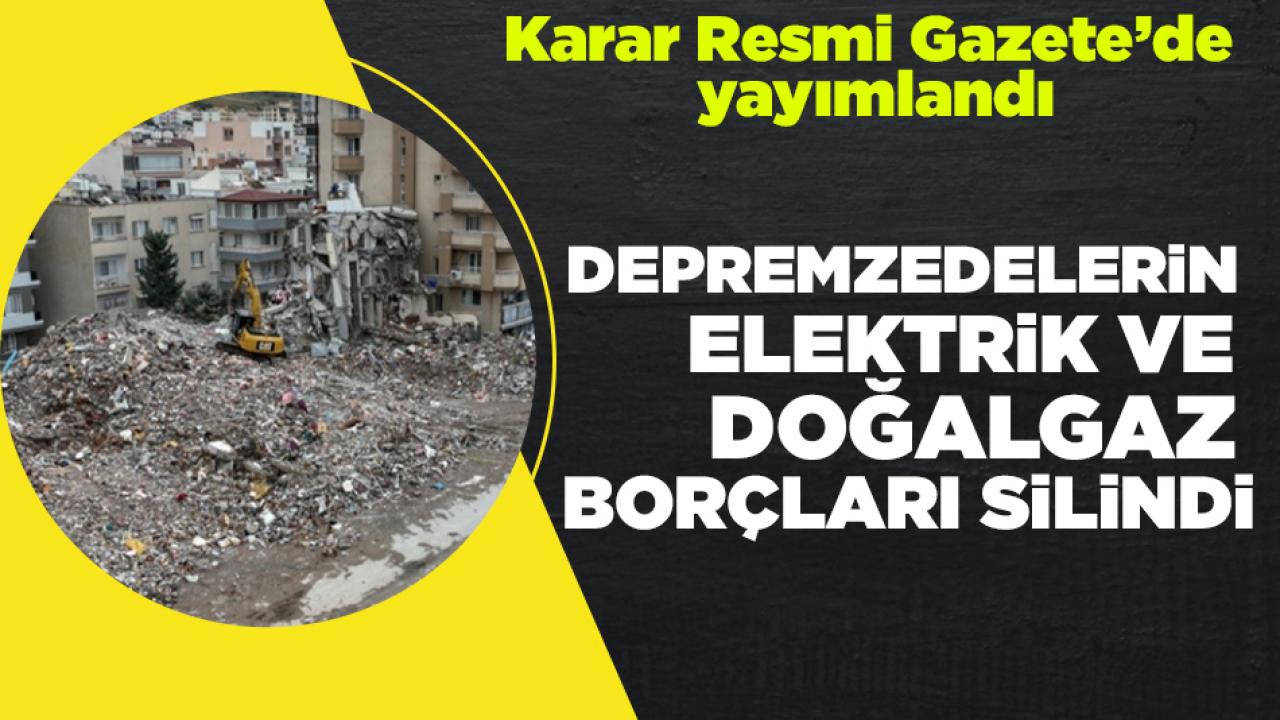 Resmi Gazete'de yayımlanan Cumhurbaşkanlığı Kararnamesi ile evi ağır ve orta hasarlı depremzedelerin elektrik ve doğalgaz borçları silindi. Silinen fatura borçlarına yönelik dava ve icra takipleri de kaldırıldı.