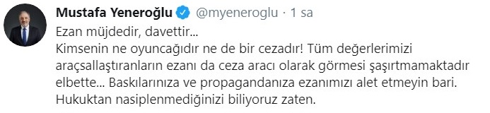 "Ezan müjdedir, davettir... Kimsenin ne oyuncağıdır ne de bir cezadır! Tüm değerlerimizi araçsallaştıranların ezanı da ceza aracı olarak görmesi şaşırtmamaktadır elbette... Baskılarınıza ve propagandanıza ezanımızı alet etmeyin bari. Hukuktan nasiplenmediğinizi biliyoruz zaten."