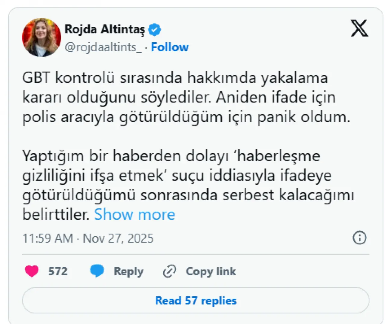 Kamuoyunu yanıltıcı içeriklerin ve gizli bilgilerin ifşasına yönelik mücadele kapsamında, gazeteci Rojda Altıntaş hakkında yasal süreç başlatıldı. Altıntaş, yürütülen soruşturma kapsamında "haberleşme gizliliğini ifşa etmek" suçlamasıyla gözaltına alındı.