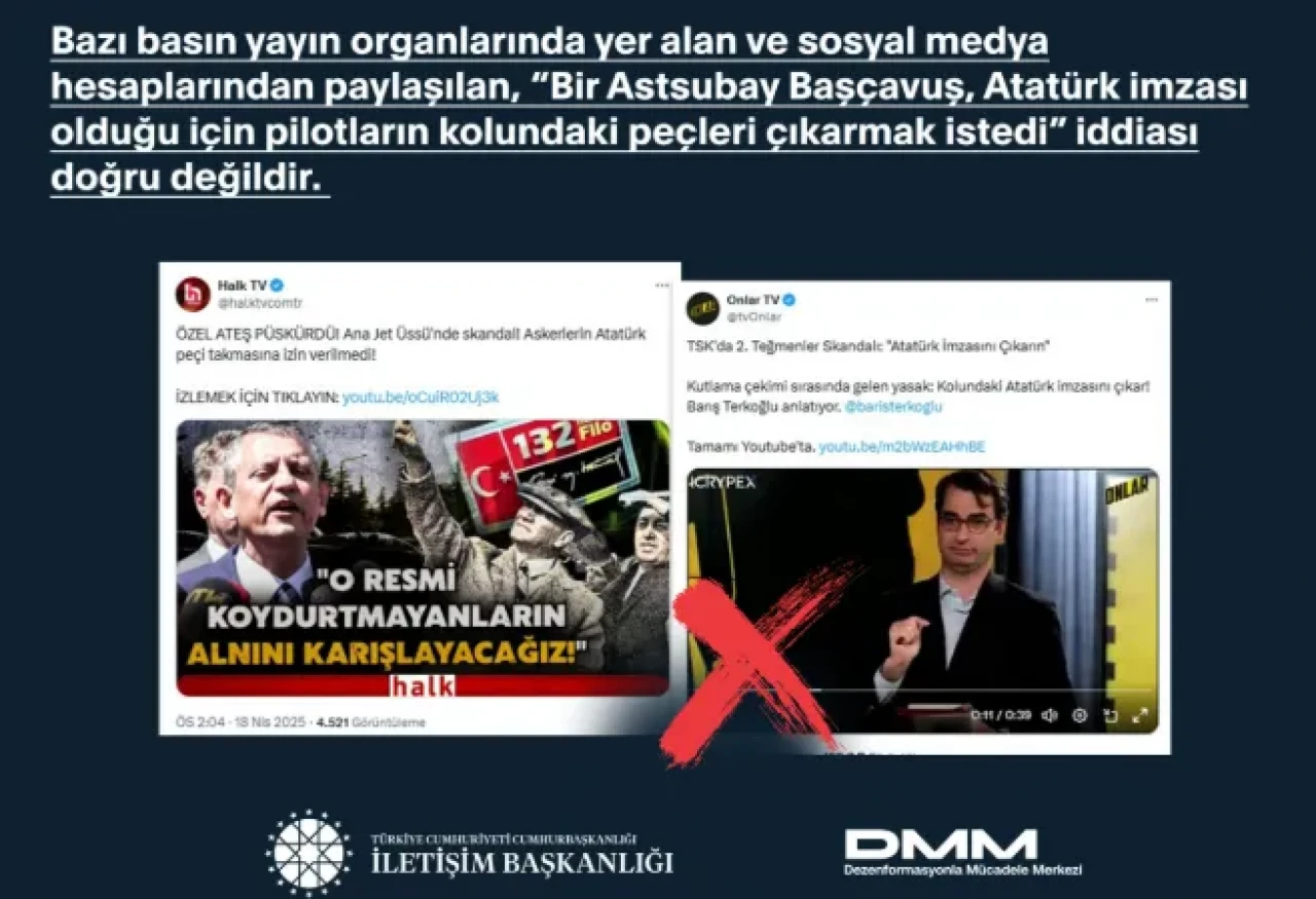 İletişim Başkanlığı bünyesinde faaliyet gösteren Dezenformasyonla Mücadele Merkezi, söz konusu iddianın gerçeği yansıtmadığını net bir şekilde ortaya koydu. Açıklamada, olayın Hava Kuvvetleri Komutanlığı tarafından hazırlanan bir tanıtım videosu çekimi sırasında yaşandığı belirtildi. Çekimlerde görevli bir Astsubay Başçavuş’un, bazı pilotların kolundaki peçlerin farklı kolda ve yönergeye aykırı biçimde yer aldığını fark etmesi üzerine bilgilendirme yaptığı ifade edildi.
