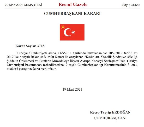 "Türkiye Cumhuriyeti, haklarının ilerletilmesinde, toplumsal rolünün güçlendirilmesinde ve şiddete karşı korunmasında daima kadının yanında olmuştur. Kadınlara Yönelik Şiddet ve Aile İçi Şiddetin Önlenmesi ve Bunlarla Mücadeleye İlişkin Avrupa Konseyi Sözleşmesi, kadına karşı şiddetle mücadele etme temel amacıyla hazırlanmış bir Sözleşmedir. Bununla beraber, Sözleşme içeriğindeki unsurlar ve çeşitli uygulamalar kamuoyunda hassasiyet yaratmış ve eleştirilere neden olmuştur. Esasen Avrupa Konseyi içinde de pek çok ülkede Sözleşme'ye ilişkin tartışmalar yaşanmakta olup, Sözleşme'yi imzalayan bazı ülkeler, onaylamaktan imtina etmişlerdir. Türkiye Cumhuriyeti'nin Sözleşme'den çekilmesi, kadına karşı şiddetle mücadeleden ödün verme olarak yorumlanmamalıdır. Türkiye Cumhuriyeti'nin ulusal mevzuatında kadın hakları en ileri normlarla güvence altına alınmıştır. Ülkemiz bu zamana kadar olduğu gibi bundan sonra da kadına karşı şiddete sıfır tolerans anlayışı, ayrıca kadın haklarının daha da güçlendirilmesi ve kadına karşı şiddetle mücadelenin daha etkin sürdürülmesi amacıyla gerekli tüm tedbirleri ilgili kurum ve kuruluşlarıyla birlikte almaya devam edecektir."